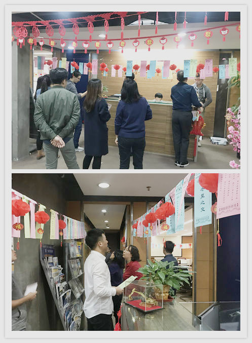 總公司前臺(tái)、會(huì)議室、辦公室走廊等掛滿了喜氣洋洋的紅燈籠以及400道彩色燈謎條。來自美鵬的高手們爭相競技,猜謎博弈,現(xiàn)場不時(shí)傳來陣陣笑語。